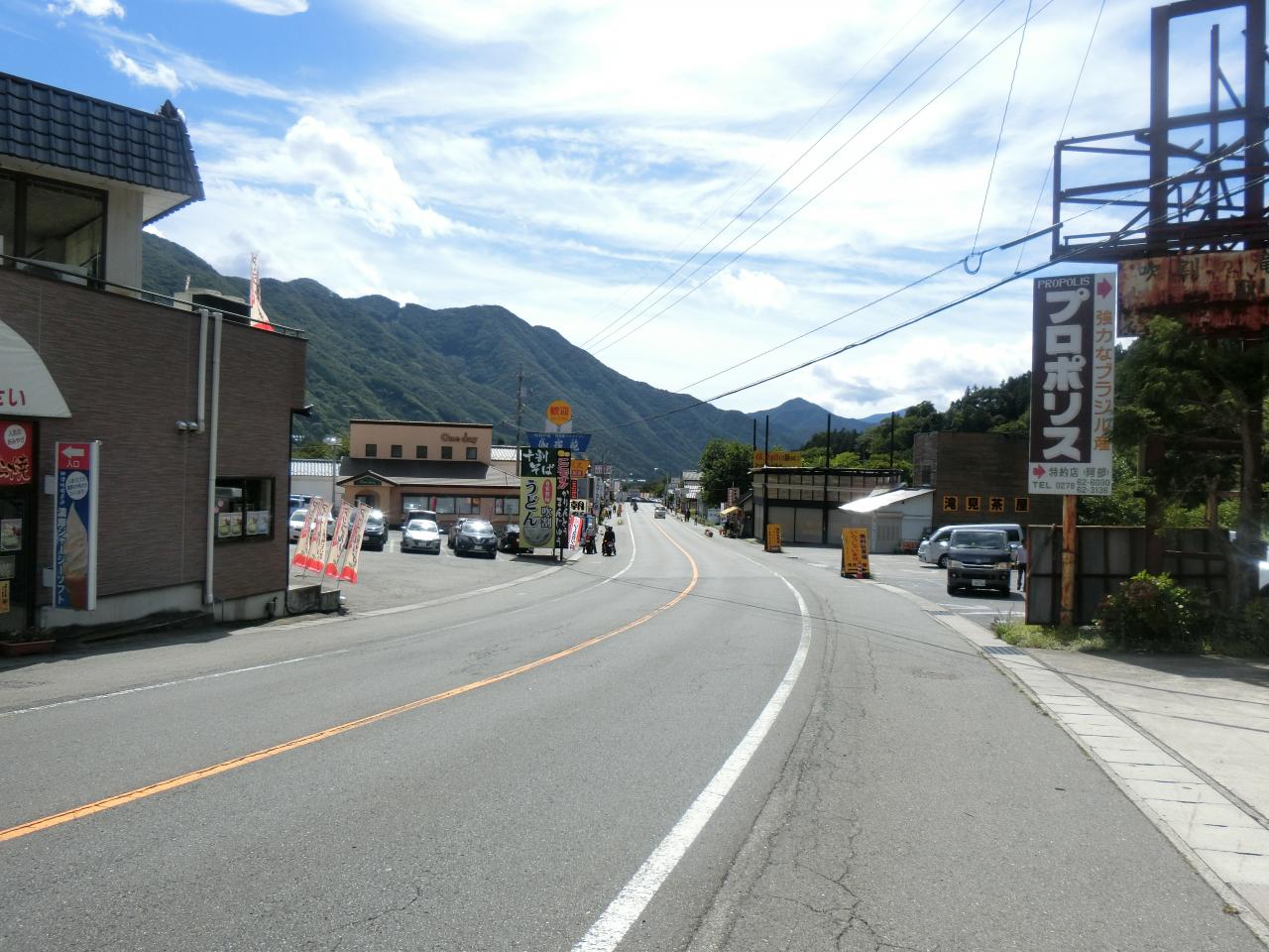 吹割の滝周辺の道沿いの風景で、緑に囲まれたのんびりとした場所です。