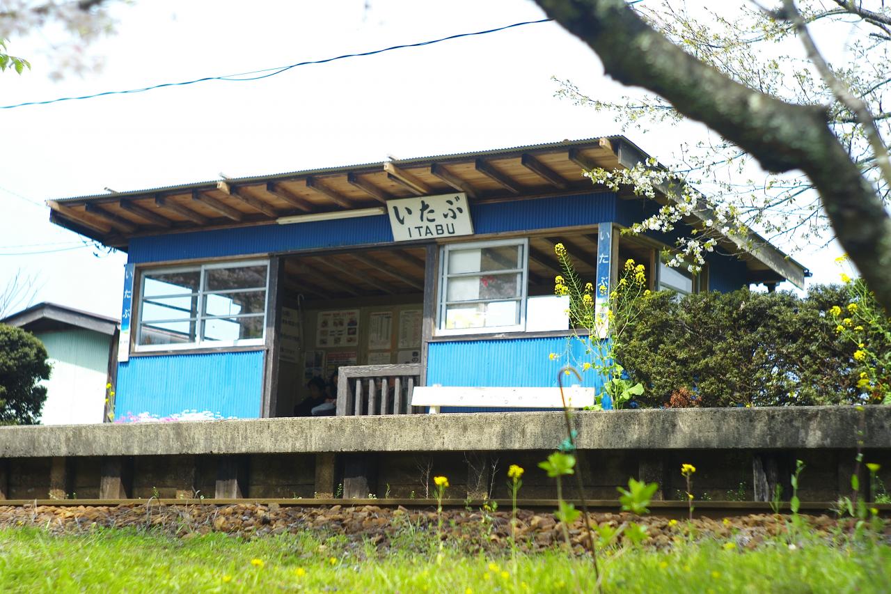 春になると、菜の花に沈む美しい飯給駅が見られる。