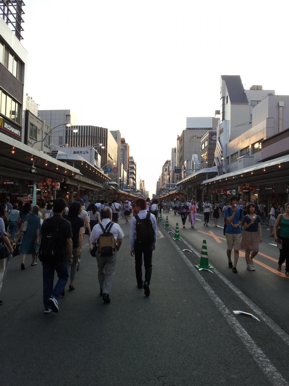 祇園祭の時に撮った写真です。普段歩けない車道が歩行者天国になっており、珍しい光景です。