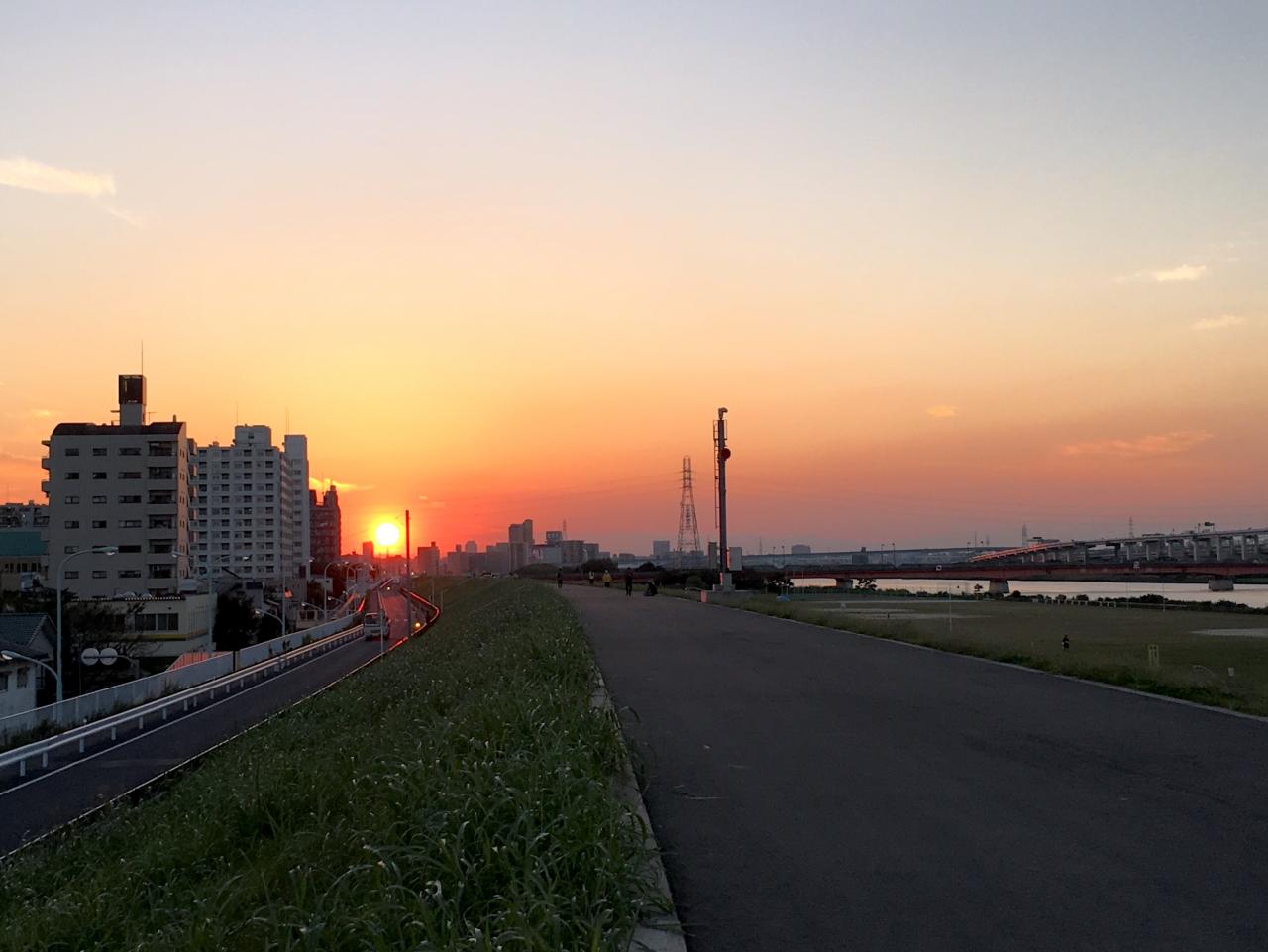 荒川河川敷の夕焼け。広々としていて開放的で、散歩やスポーツ、読書などゆったりとした時間を過ごすのに最高の場所です。